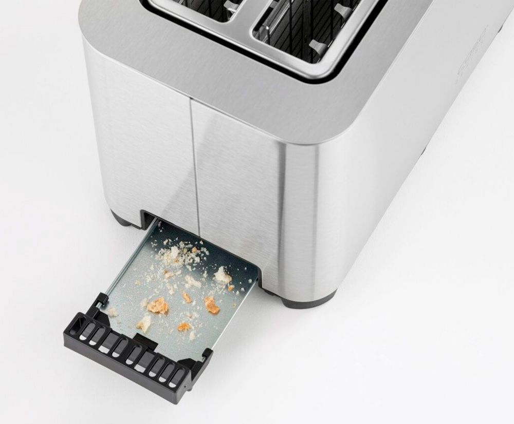 Корпус тостера выполнен из нержавеющей стали. В комплекте идет лоток для крошек, который позволяет легко убрать остатки хлеба из тостера и поддерживать кухонный стол в чистоте.