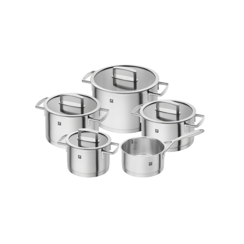 В набор входит: кастрюля (16 см / 2 л), кастрюля (20 см / 3,5 л), кастрюля (24 см / 6 л), сотейник (20 см / 3 л), кастрюля (16 см / 1,5 л)