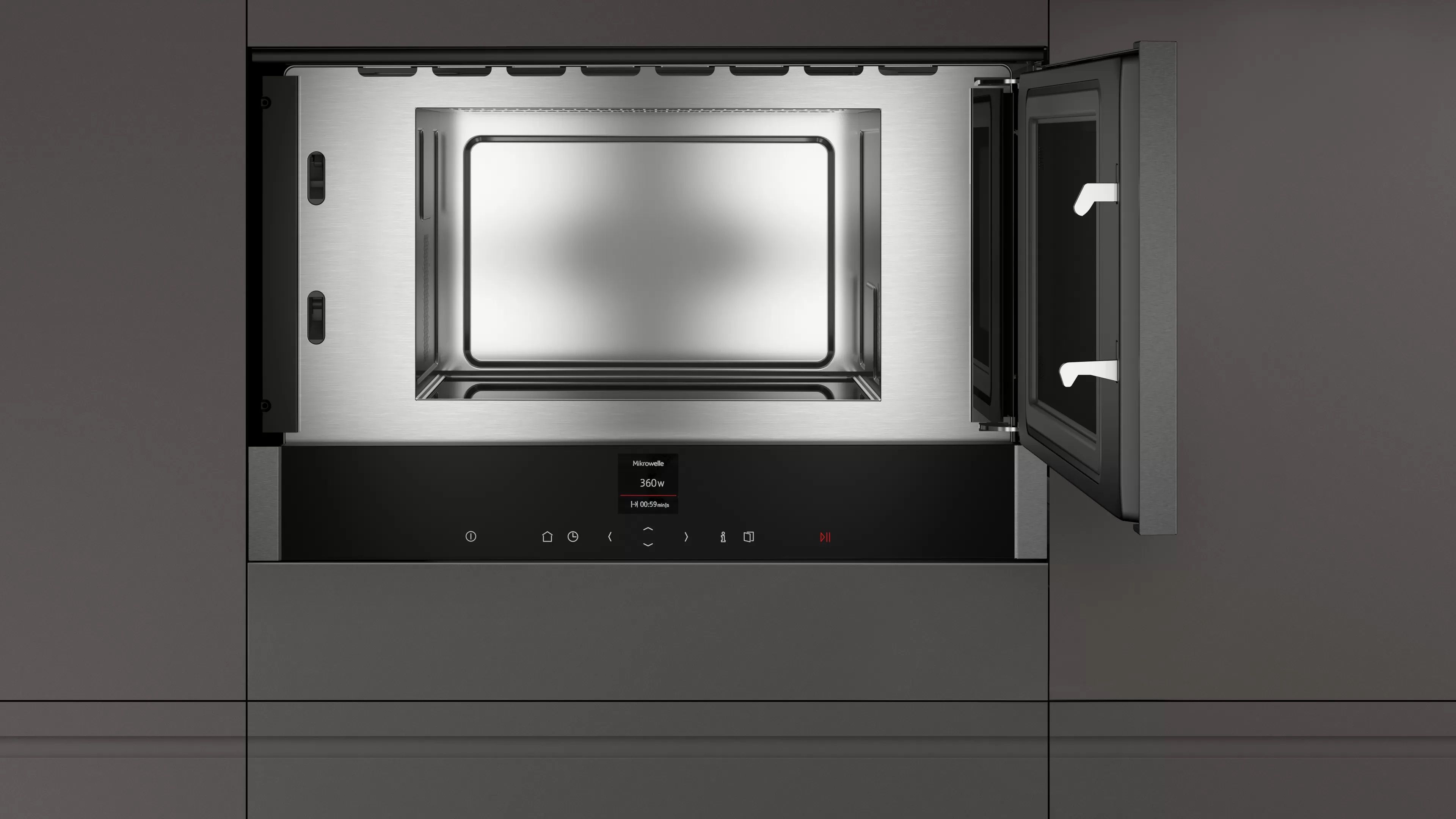 Встраиваемая микроволновая печь, GraphiteGrey, инвертерная технология Innowave®, максимальная мощность микроволн до 900 Вт, 5 уровней мощности, 2-слойное остекление дверцы, 7 автоматических программ, камера из нержавеющей стали объемом 21л, текстовый дисплей 2,5" с управлением ShiftControl, LED-освещение,  дверца открывается вправо, сделано в Великобритании