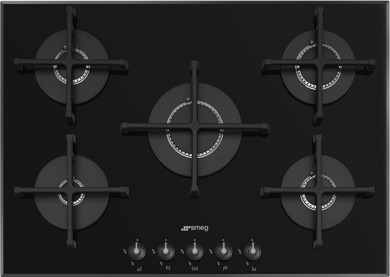 Зоны приготовления: 5 газовых горелок с автоматическим электроподжигом и газ-контролем. Левая фронтальная конфорка, вспомогательная (1,1 кВт), Левая задняя конфорка, полубыстрая (1,7 кВт), Центральная конфорка, быстрая (3,2 кВт), Правая фронтальная конфорка, полубыстрая (1,7 кВт), Правая задняя конфорка, быстрая (2,6 кВт).