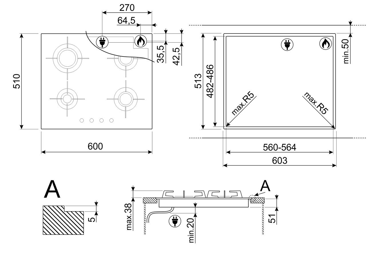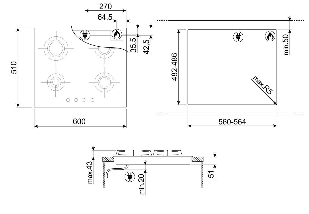 Доп. принадлежности (приобретаются отдельно): LGCN (соединительная планка для встраиваемых варочных панелей, нерж. сталь, 475/495 мм); WOKGHU (чугунное кольцо WOK).