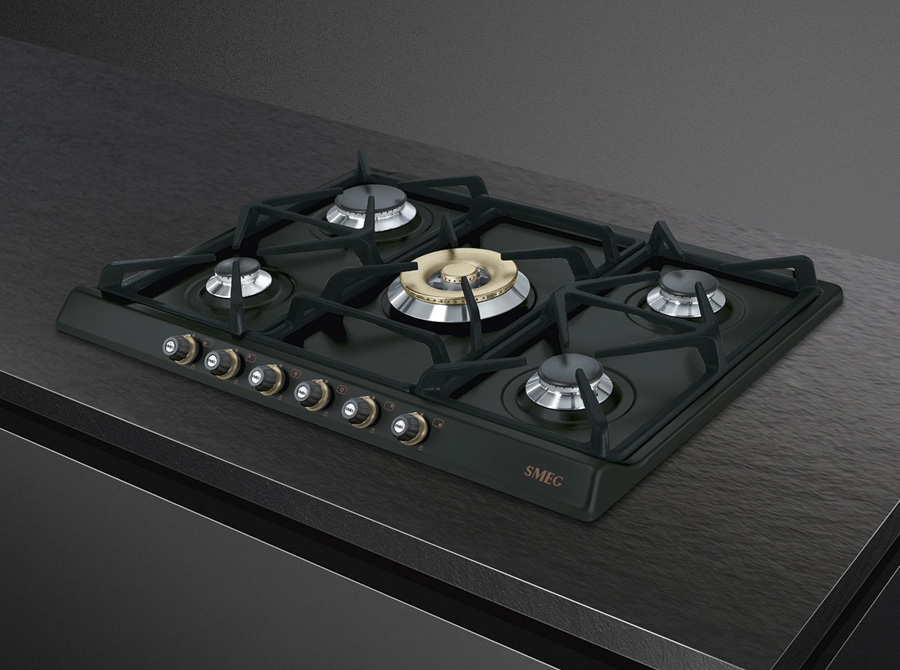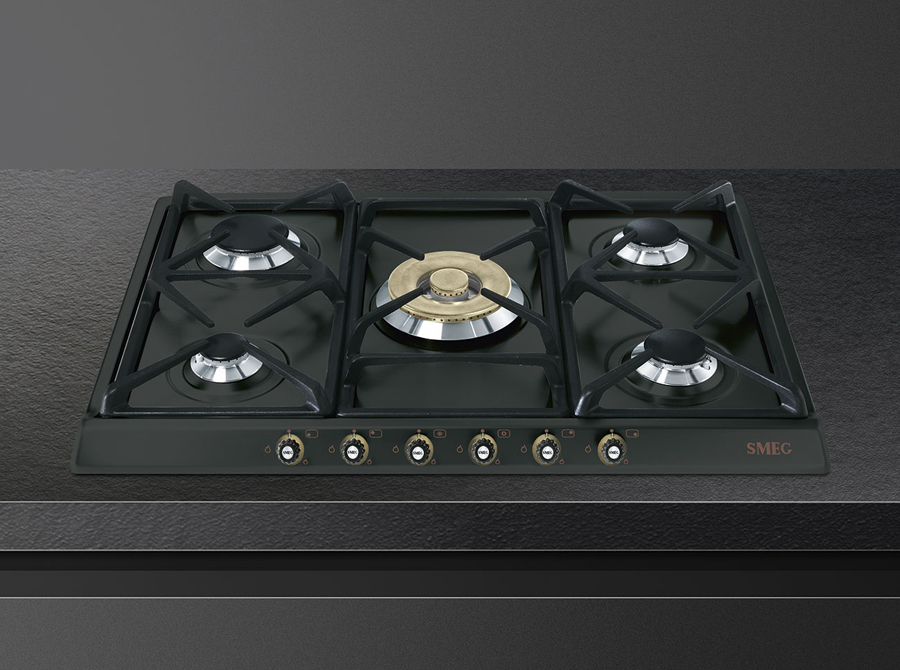 Эстетика: Цвет: антрацит; Эстетика: Cortina; Фурнитура: латунная; Материал корпуса: эмалированный; 6 фронтальных поворотных переключателей; Цвет переключателей: чёрный; Решетки: чугунные; Горелки: Smeg Contemporanea; Материал горелок: алюминий; Цвет сериографии: серый.