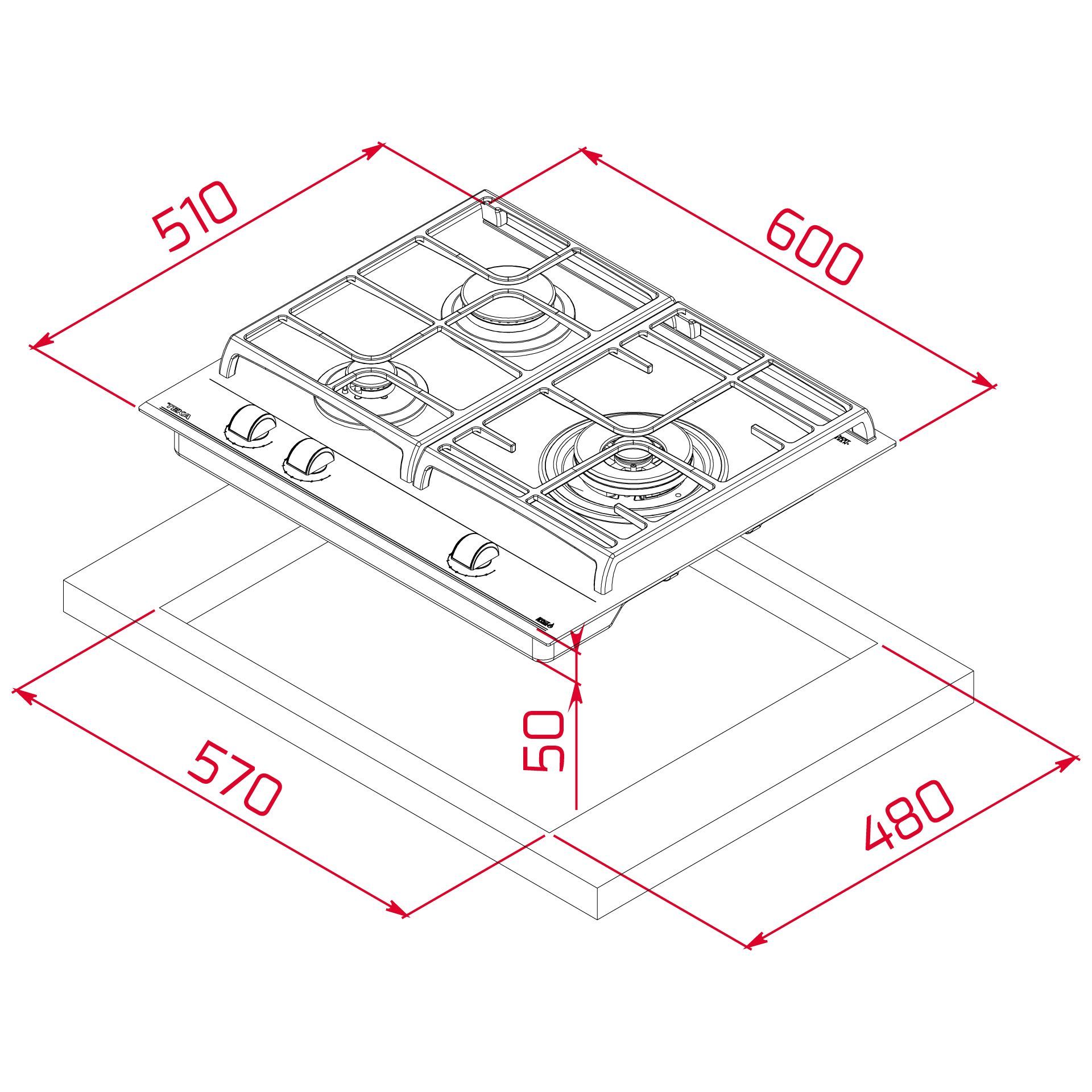 варочная панель газ на стекле 60 см, чёрная стеклокерамика Schott Ceran 4 мм. с фацетом по переднему краю, эргономичные регуляторы с 9-тью уровнями мощности, высокоточная регулировка пламени, съёмные горелки чёрного цвета Sabaf HE, съёмные чугунные решетки, клипсы для простого монтажа в столешницу без винтов, автоподжиг на каждой горелке, газ-контроль на каждой горелке, 3 зоны приготовления: 1 горелка с двойным кольцом (4 кВт), 1 быстрая горелка (2,8 кВт); 1 вспомогательная горелка (1 кВт), номинальная тепловая мощность: 7,8 кВт, тип газа: LPG (бутан, пропан), природный, размеры 600 х 510 х 50 мм, комбинируется с панелями IZ/TZ/CZ с фацетом по переднему краю высотой 510 мм, планка для комбинирования код 40204394, сделано в Италии