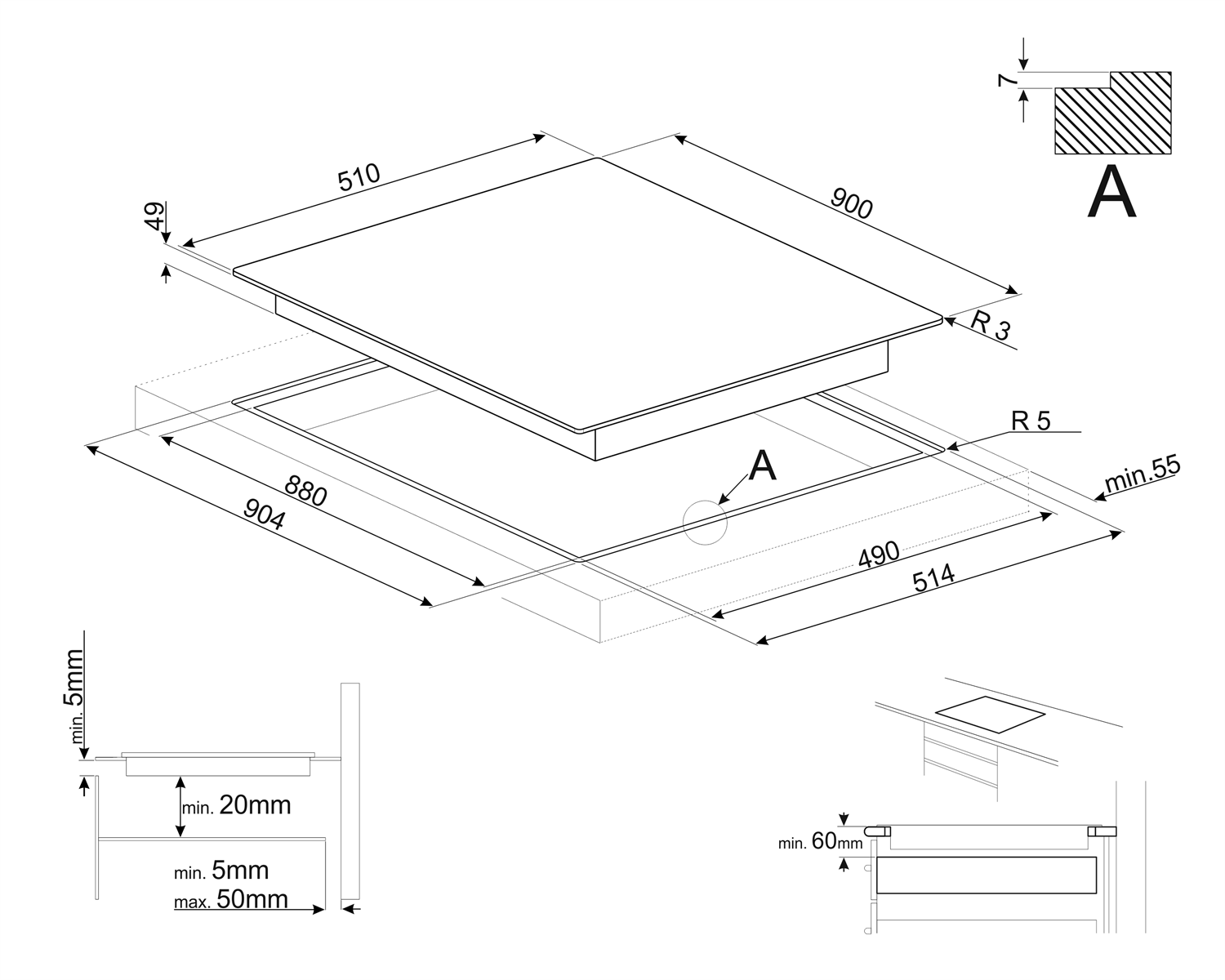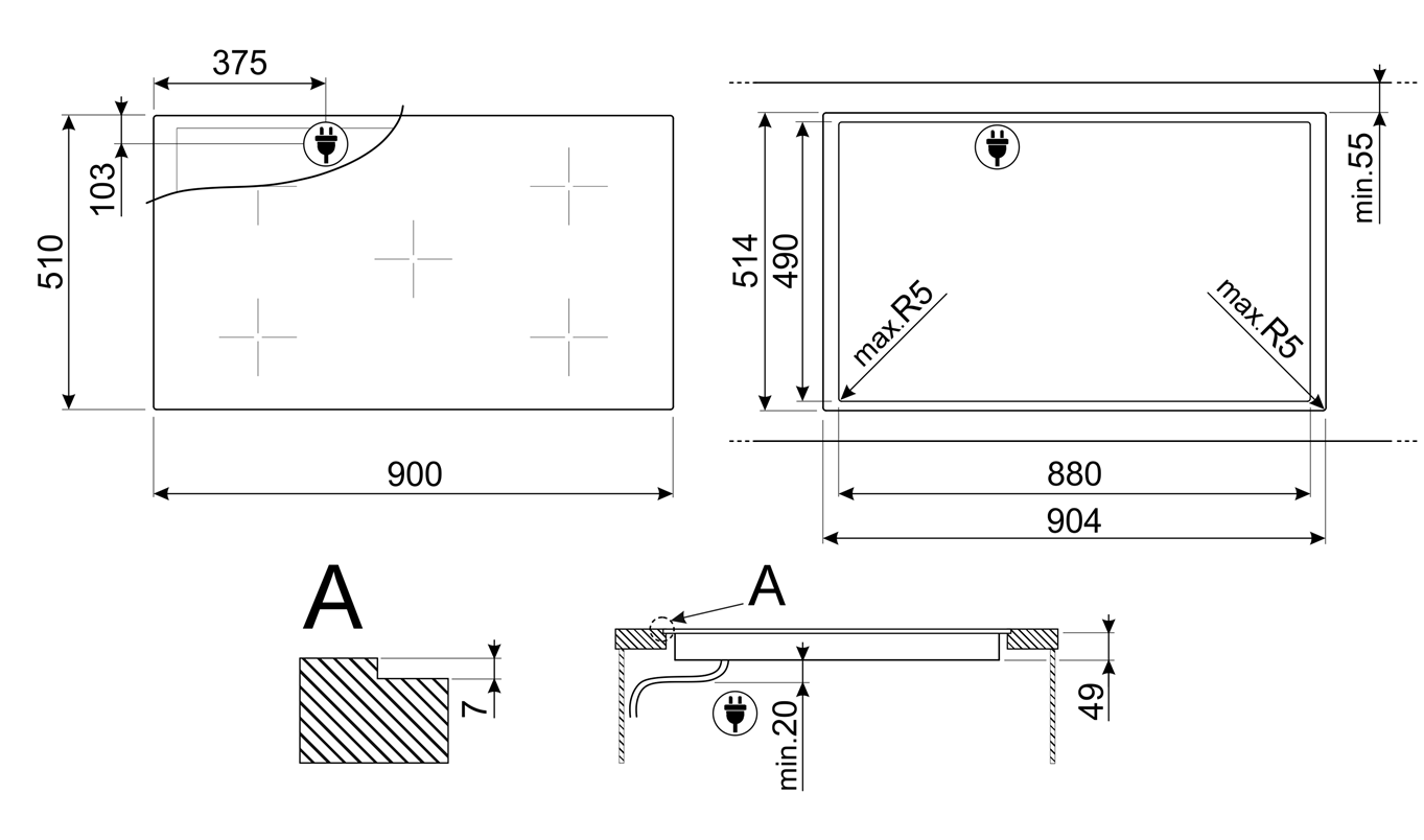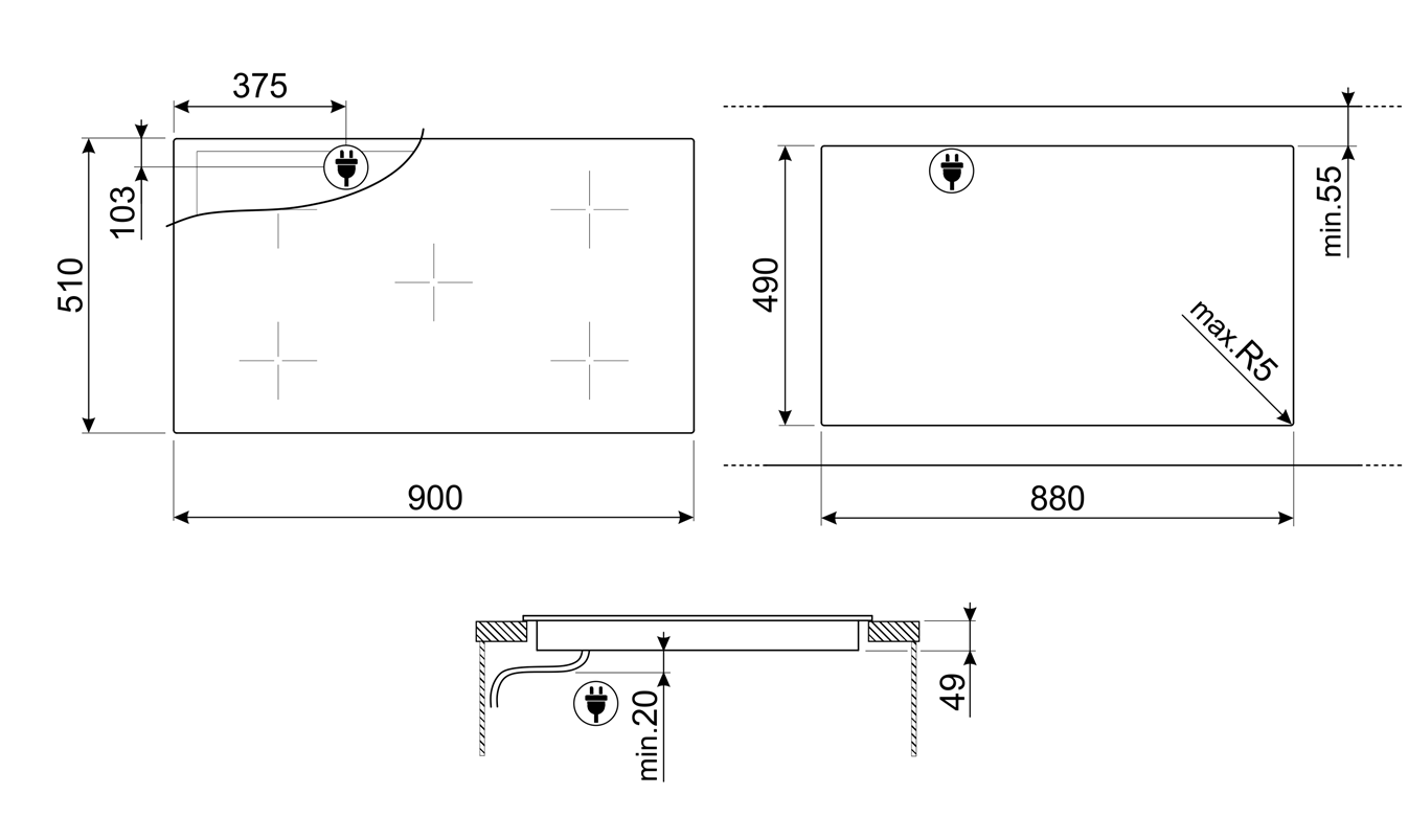 Правая – 2,3 + 2,3 кВт (Booster 3,2 + 3,2 кВт), 420х210 мм