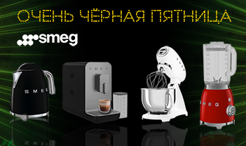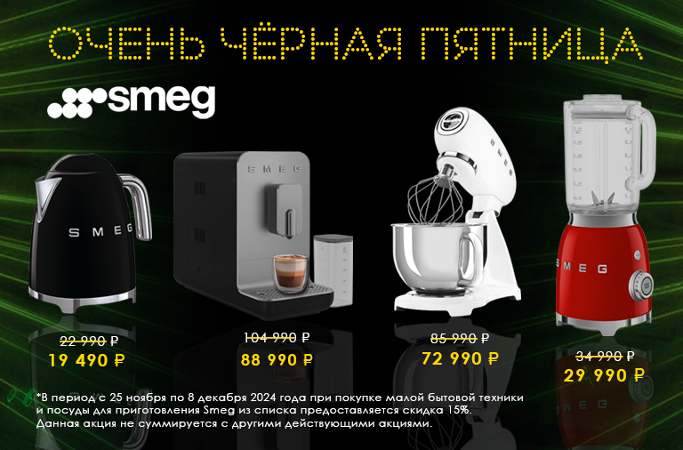 *В период с 25 ноября по 8 декабря 2024 года при покупке малой бытовой техники и посуды для приготовления SMEG из списка предоставляется скидка 15%.